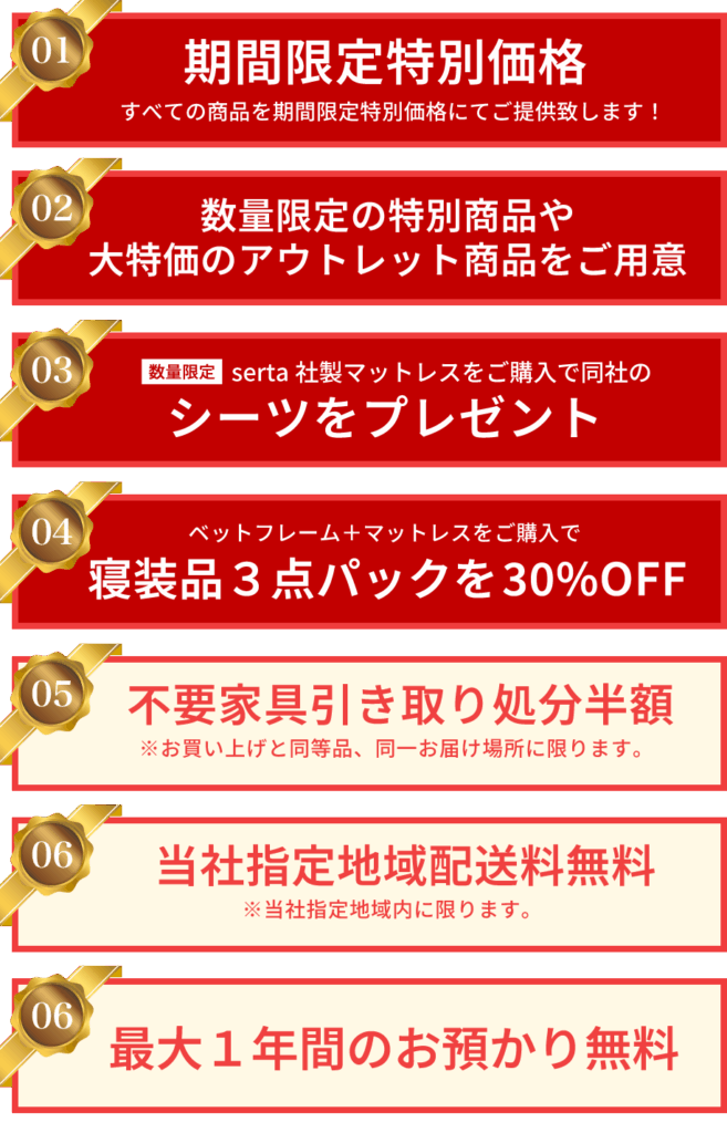 サータ広島工場からの1点ものはもちろん、廃盤品、展示品、通常商品も大特価でご提供させていただきます。本当に良いものをお値打ちに、多くのものから試したい。このような思いに応えられるようにこのセールを開始致します。さらに、WEB申込限定でご成約特典もあります。