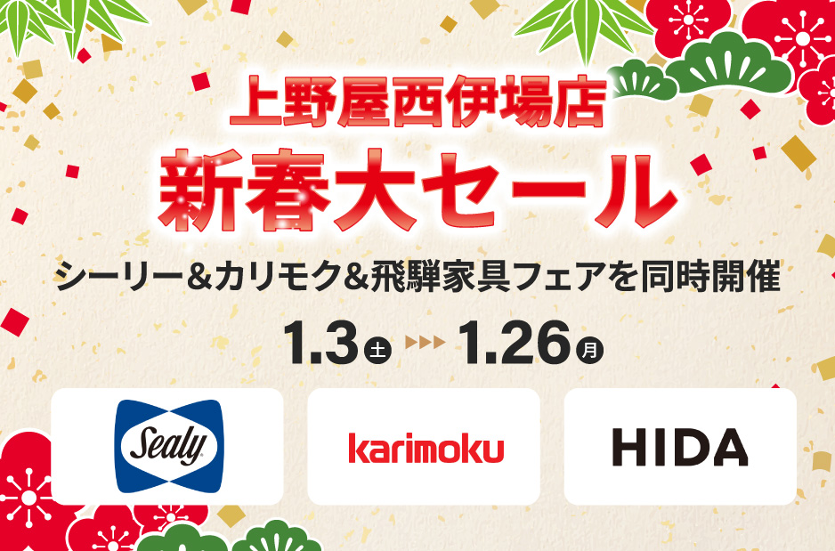 【新春大セール!】 シーリー&カリモク&飛騨家具フェアを同時開催
