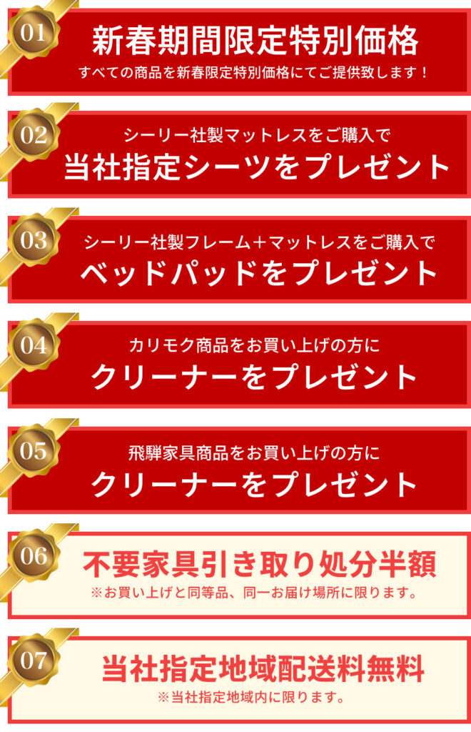 新春特別価格でシーリーベッド&カリモク&飛騨家具フェアを開催!